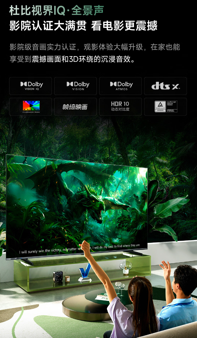 该系列电视获 Dolby Vision IQ、 Dolby Atmos、Dolby Vision Gamming、DTS X 等认证,支持 3D 环绕音效,可本地播放蓝光片源、看 NAS 云盘内的视频内容(支持 Samba、NFS、Webdav 协议)。