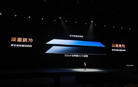 同时,新机屏幕采用复合叠层结构,非牛顿流体+332cm²业界最大的UTG玻璃,整机抗冲击能力提升30%。