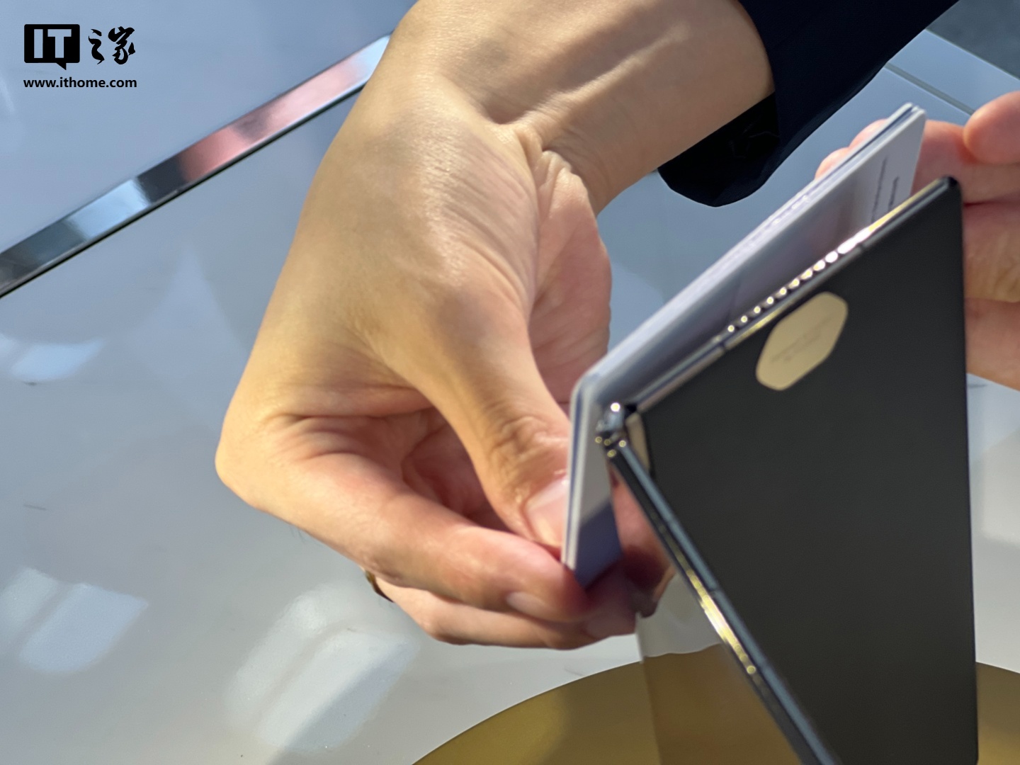 根据工作人员演示,华为 Mate XT 非凡大师展开后的厚度类似 3 张银行卡堆叠。