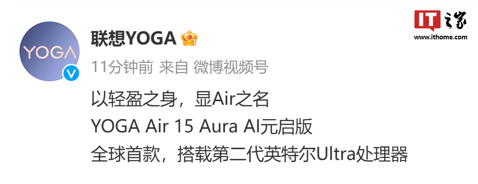 IT之家 9 月 10 日消息,联想 YOGA 今日宣布,YOGA Air 15 Aura AI 元启版是全球首款搭载第二代英特尔 Ultra 处理器的笔记本电脑。