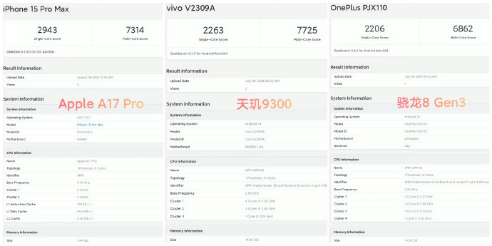 另据 @数码闲聊站 称,这个跑分的机型是 iPhone 16,该机搭载 A18 处理器。苹果表示,iPhone 16 的 A18 处理器比 iPhone 15 和 iPhone 15 Plus 的 A16 Bionic 快最多 30%。该博主还放出了其它主流移动处理器的跑分作为对比,具体如下图所示: