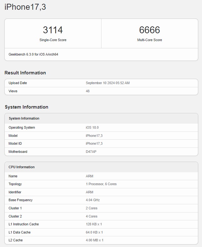 IT之家注意到,该机型的代号为 iPhone 17,3,表明其确为 iPhone 16 系列的一员。其单核成绩为 3114 分,表现不错。然而,多核成绩却低于 iPhone 15 Pro Max 的 A17 Pro。这可能是由于 Geekbench 6 尚未更新,无法准确反映 iPhone 16 的性能。