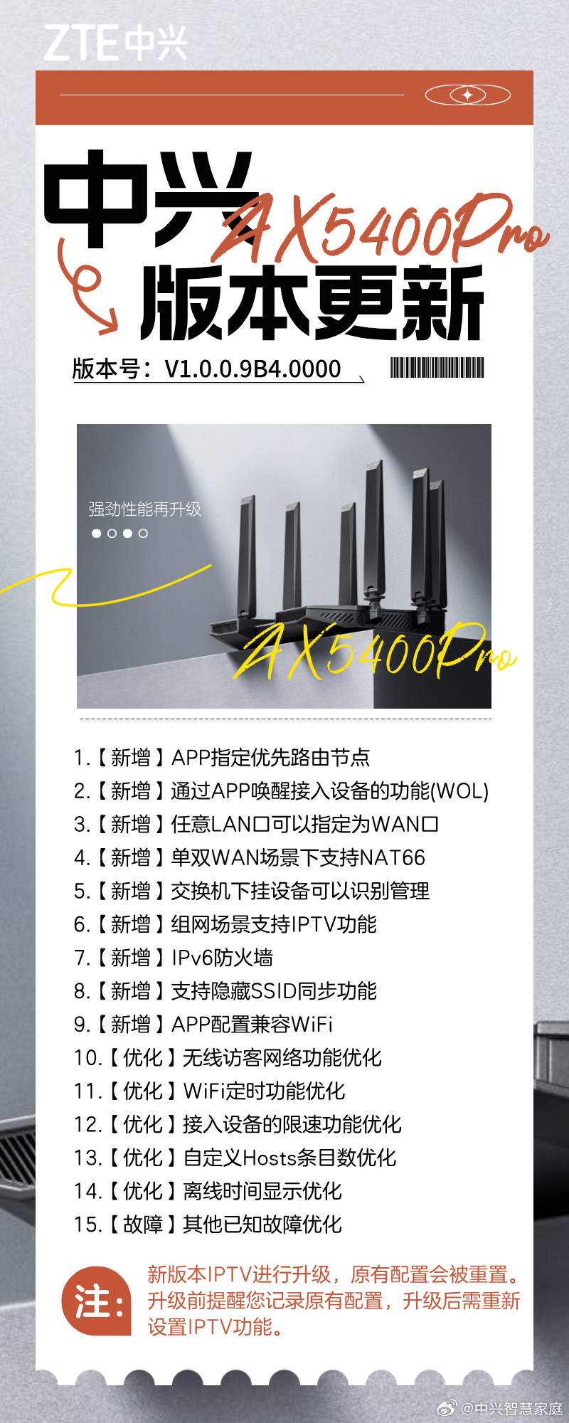 IT之家附中兴 AX5400 Pro 路由器此次更新详情如下: