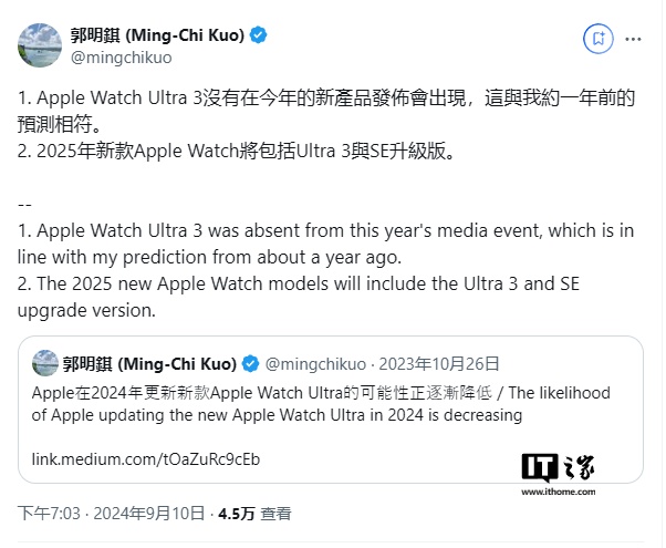 IT之家 9 月 10 日消息,苹果供应链分析师郭明錤今日预测,Apple Watch Ultra 3 和 Apple Watch SE 3 将于 2025 年发布。