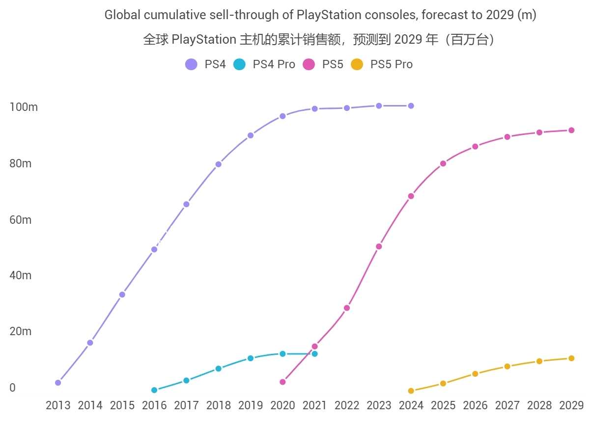 鉴于这种中期升级本身具有的局限性,Harding-Rolls预测称,PS5 Pro最后的销售结果应该与当年的PS4 Pro差不多。PS4 Pro在2016年的首发窗口期间卖出170万台,整个生命周期内售出1450万台。他预测PS5 Pro今年有望出货130万台,到2029年累计卖出约1300万台。