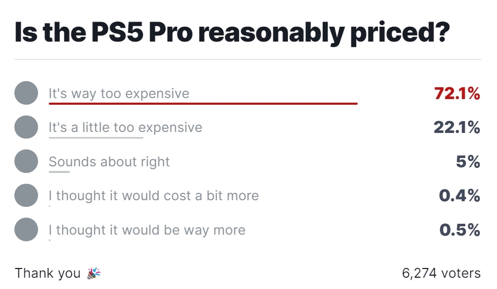 在知名游戏网站IGN的最新调查中,6000余人参与的投票显示,72.1%的受访者认为PS5 Pro的定价太贵了,另外还有22.1%的人认为定价有一点贵。同时认为价格可以接受、甚至低于预期的受访者加起来约6%。