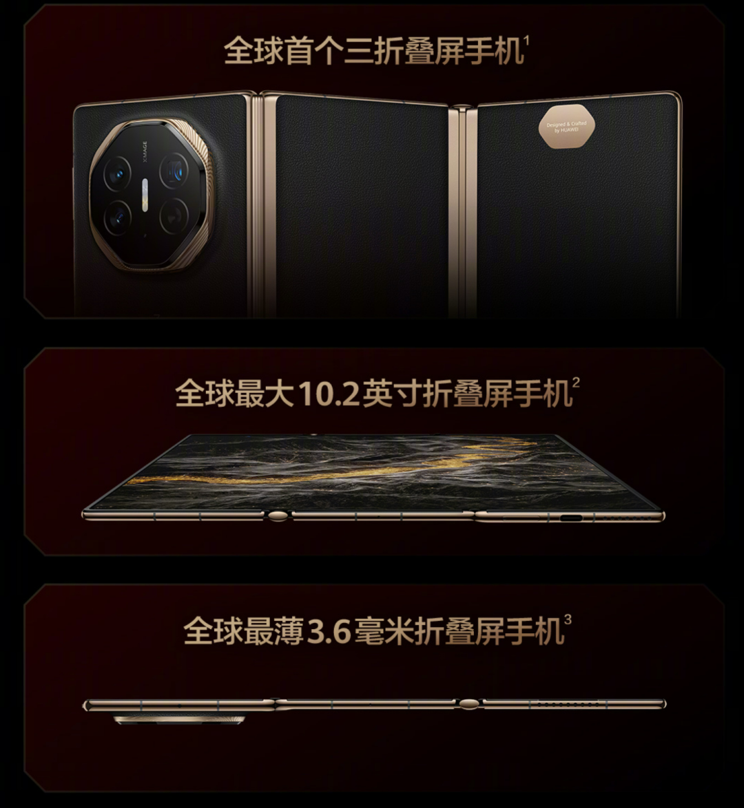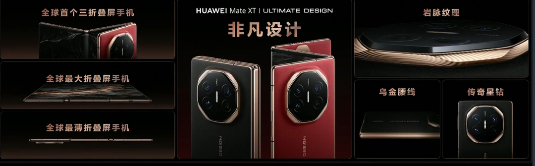 在发布会中,率先登场的自然是备受期待的 Mate XT 非凡大师三折叠屏手机。