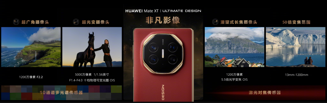 最后看看“非凡影像”,Mate XT 非凡大师搭载了 XMAGE 三摄系统。具体为 5000 万像素主摄、1200 万像素超广角和 1200 万像素潜望长焦。