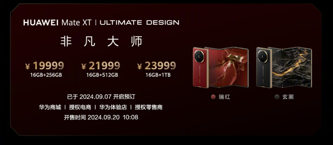 价格方面,Mate XT 非凡大师提供 16GB+256GB、16GB+512GB、16GB+1TB 三个存储版本。