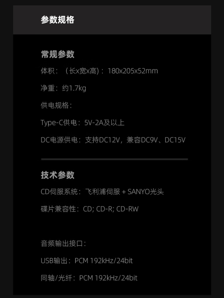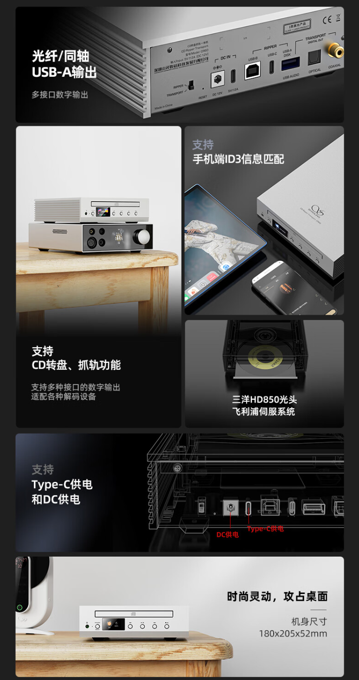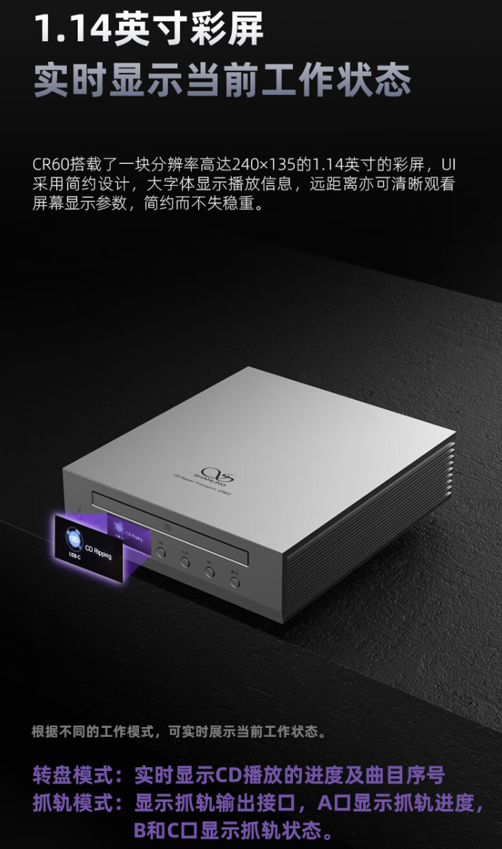 据介绍,山灵 CR60 CD 转盘抓轨一体机机身尺寸 180×205×52mm,采用三洋 HD850 光头 & 飞利浦伺服系统,转盘模式支持光纤 / 同轴 / USB-A 多接口数字输出(PCM 192kHz / 24bit);抓轨模式可直连存储设备、电脑手机等,可直接抓轨并保存。