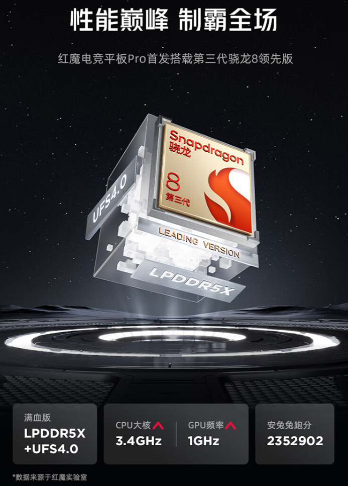 红魔电竞平板 Pro 首发搭载高通骁龙 8 Gen3 领先版处理器,CPU 大核 3.4GHz,GPU 频率 1GHz,配合满血版 LPDDR5X+UFS4.0 组合,跑分超 235 万。