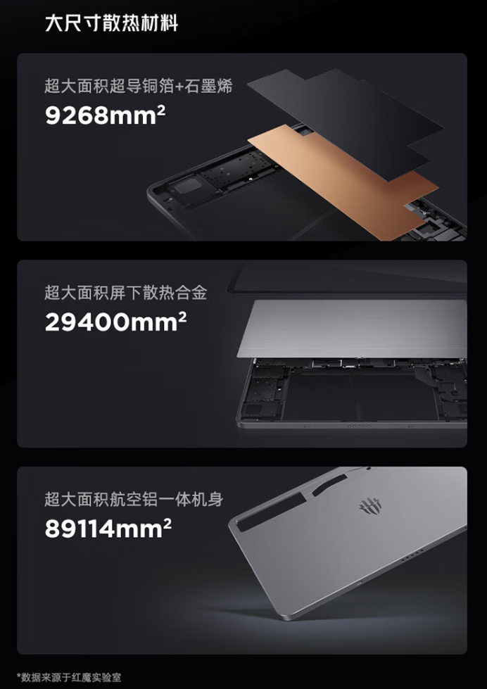 该平板采用 PAD 魔冷散热 ICE 2.0,配备高速离心风扇(20000 转速) + 3D 热管(导热系数 6000W / m・K)+ 3D 内循环风道,拥有 29400mm² 屏下散热合金,9268mm² 超导铜箔,89114mm² 一体航空铝机身。