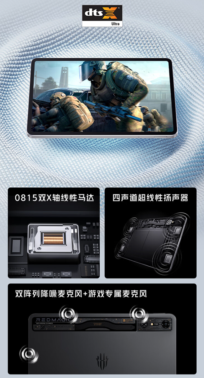 红魔电竞平板 Pro 尺寸为 10.9 英寸,屏幕分辨率 2880×1800,支持 144Hz 高刷;后置 5000W 摄像头,前置 2000W 摄像头;配备 0815 双 X 轴线性马达、四声道超线性扬声器、游戏 3 麦克风;支持指纹解锁 + NFC TAG + 全功能 Type-C。