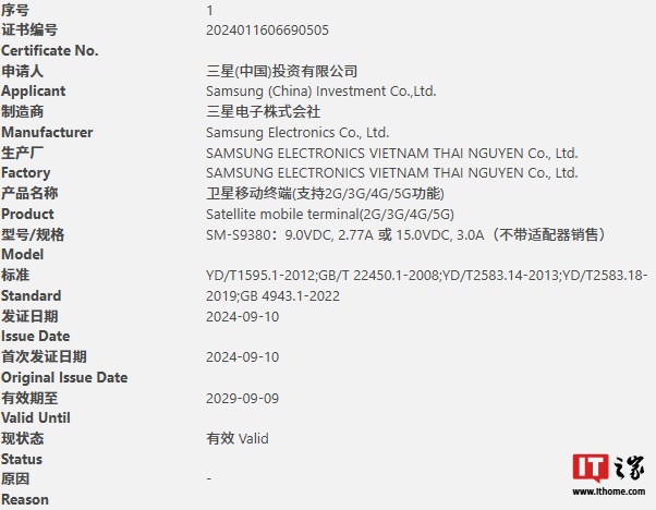 IT之家 9 月 11 日消息,型号为“SM-S9380”三星卫星移动终端已通过国内 3C 认证。认证信息显示,该机支持 2G / 3G / 4G / 5G 通信功能,提供 25W / 45W 快充(不带适配器销售)。