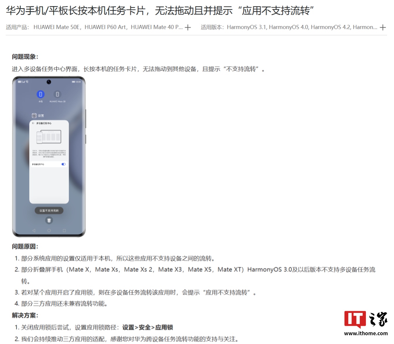 IT之家注意到,华为 Mate XT 非凡大师三折叠手机不支持鸿蒙 HarmonyOS 系统的多设备任务流转功能,无法拖动应用“传送”给其他设备使用。华为官网显示,部分折叠屏手机在 HarmonyOS 3.0 及以后版本不支持多设备任务流转,机型如下: