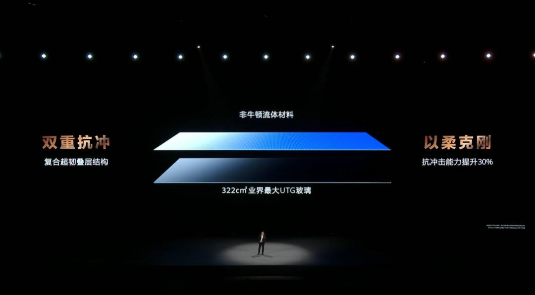 巨大的屏幕,带来了对屏幕强度更极端的要求。在曾经传统双折叠手机上,迄今为止最大的问题之一 ,就是屏幕强度的不足。华为本次在三叠屏上,使用了一种超微折叠有机材料,同时是使用非牛顿流体材料 + UTG 玻璃组成复合超韧叠层结构,号称让 Mate XT 屏幕的抗冲击能力提升 30%。
