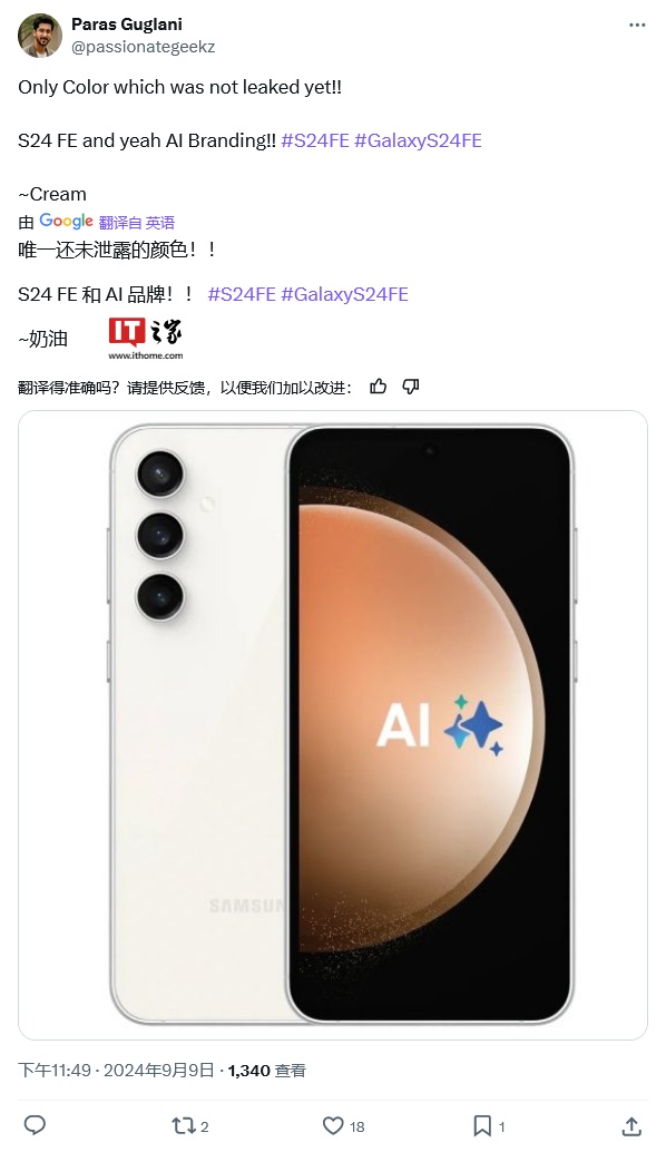 IT之家 9 月 11 日消息,德国科技媒体 Winfuture 报道称,三星 Galaxy S24 FE 智能手机在欧洲市场售价为 799 欧元(IT之家备注:当前约 6279 元人民币),相比较 Galaxy S23 FE 的 699 欧元,涨价 100 欧元,涨幅 14.3%。