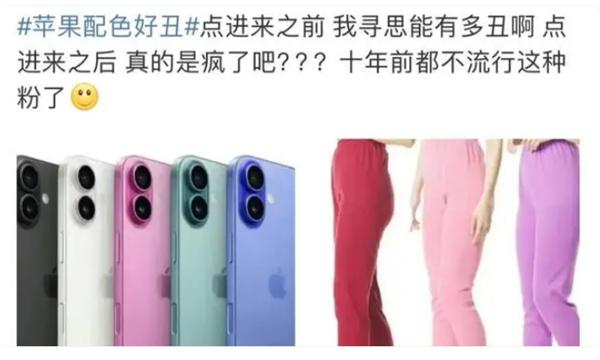 苹果发布会刚结束不久,配色好丑这一话题就登上了热搜,甚至有网友吐槽iPhone 16配色就像秋衣秋裤和垃圾袋的颜色。网友们纷纷调侃,“好廉价的颜色”、“颜色真的好丑”、“饱和度太高了”。还有网友自我安慰称“丑不丑的没所谓,反正都要来个手机壳”。