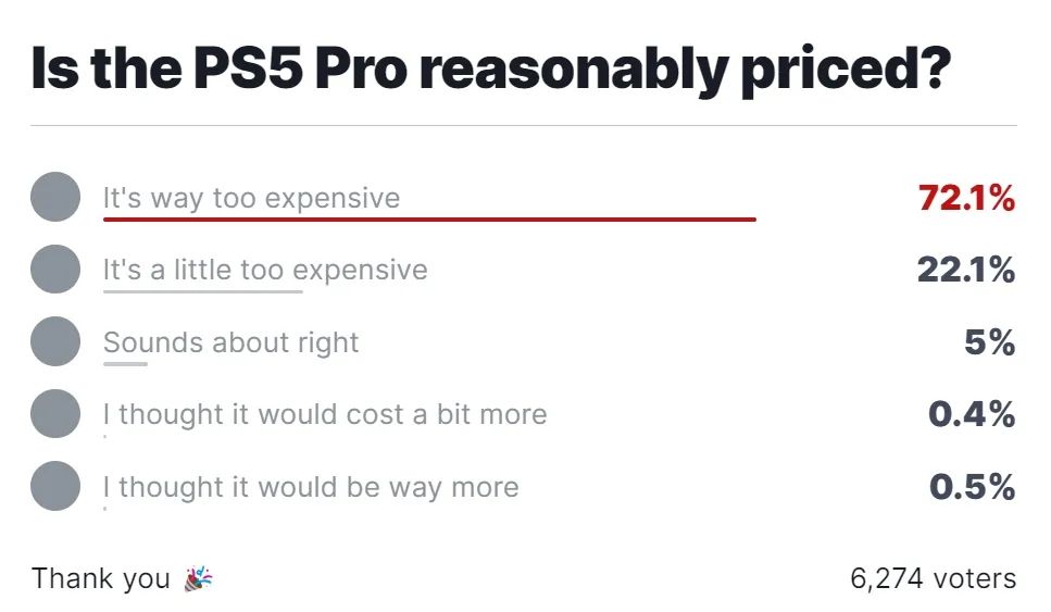 在知名游戏网站IGN的最新调查中,6000余人参与的投票显示,72.1%的受访者认为PS5 Pro的定价太贵了,另外还有22.1%的人认为定价有一点贵。同时认为价格可以接受、甚至低于预期的受访者加起来约6%。