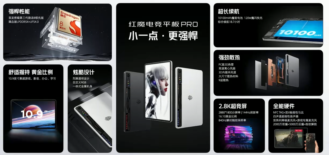 据介绍,红魔电竞平板 Pro 首发搭载高通骁龙 8 Gen3 领先版处理器,内置 10100mAh 容量电池,支持 120W 快充;平板尺寸为 10.9 英寸,屏幕分辨率 2880×1800,支持 144Hz 高刷。