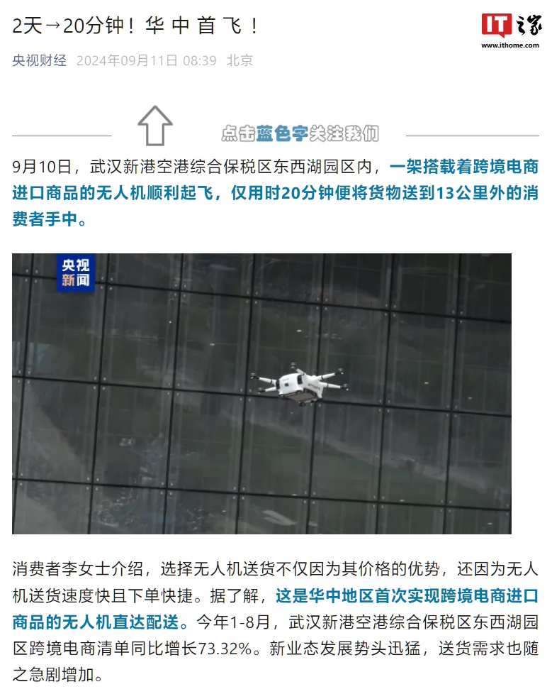 IT之家 9 月 11 日消息,综合新华社、央视今天报道,9 月 10 日上午,一架搭载着跨境电商进口商品的无人机从武汉新港空港综合保税区东西湖园区内顺利起飞,并于 20 分钟后将商品送到 13 公里外位于东西湖万达广场的消费者手中。