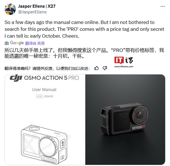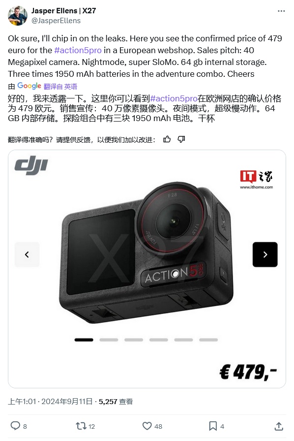 IT之家 9 月 11 日消息,消息源 @JasperEllens 今天(9 月 11 日)在 X 平台发布推文,曝料称大疆(DJI)Osmo Action 5 Pro 运动相机售价为 479 欧元(IT之家备注:当前约 3764 元人民币),主要卖点为 4000 万像素摄像头、夜视模式、超级慢动作。