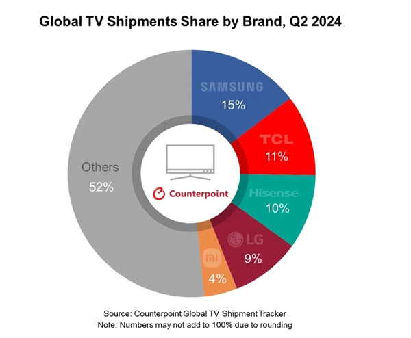 这背后,主要是因为中国竞争对手的抢眼表现。比如 TCL 在 2024 年第 2 季度高端电视出货量同比增长 78%、收入同比增长 81%,更重要的是 TCL 在 2024 年二季度成功夺回三星占据三年之久的 Mini LED 电视出货量头把交椅,两家企业在该领域的收入份额差距也缩小至一个百分点以内。