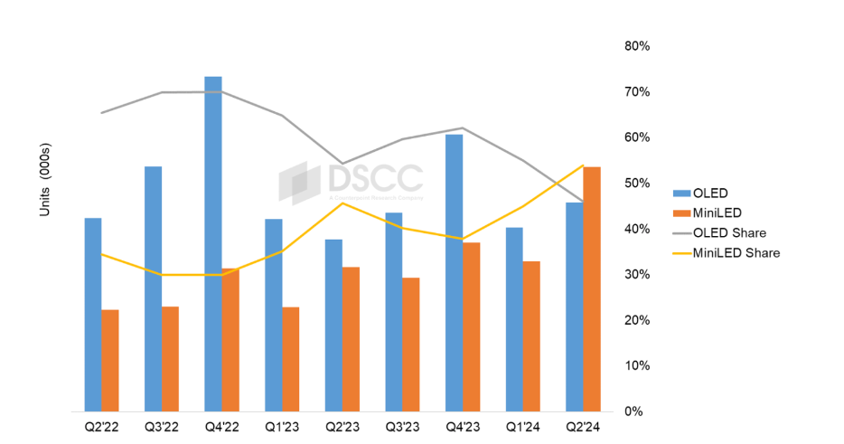 2024 年第二季度,高端电视的出货量同比增长了 44%,收入同比增长了 28%。其中 OLED 电视的出货量同比增长了 21%,收入同比增长了 5%,而 Mini LED 电视出货量同比增长了 68%,收入增长了 60%。Mini LED 在出货量和收入上均超过了 OLED。
