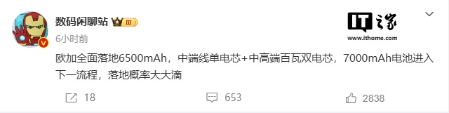 该博主表示:“欧加全面落地 6500mAh,中端线单电芯 + 中高端百瓦双电芯,7000mAh 电池进入下一流程,落地概率大大滴。”这意味着,OPPO 及其子品牌一加和真我即将推出的新机型在电池容量上将进一步提升。