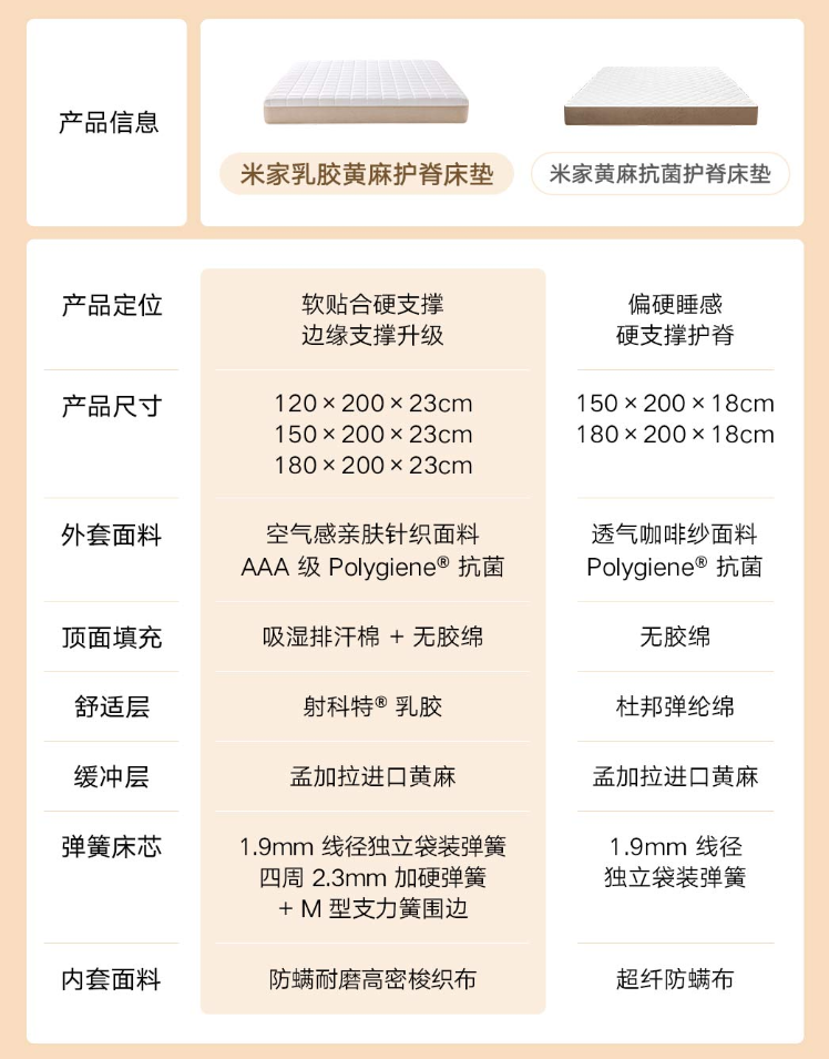 商品页面显示,这款床垫采用精梳 S 形黄麻,加入高弹乳胶,“使脊椎维持自然舒展状态”。23cm 加厚床垫由亲肤抗菌面层、物理防螨内套、泰国天然乳胶、S 形孟加拉黄麻、独立袋护脊弹簧组成。
