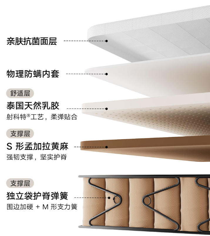 黄麻经 180℃ 高温热压工艺,呈现自然弯曲 S 形结构,经物理高温压制,脱糖杀菌处理,不易霉变。床垫采用 1.9mm 大线径独立袋装弹簧,贴合身体曲线;每个独立弹簧,均由无纺布独立包裹。泰国直采天然乳胶采用意大利射科特工艺,搭配开放式气孔和内部蜂巢结构。