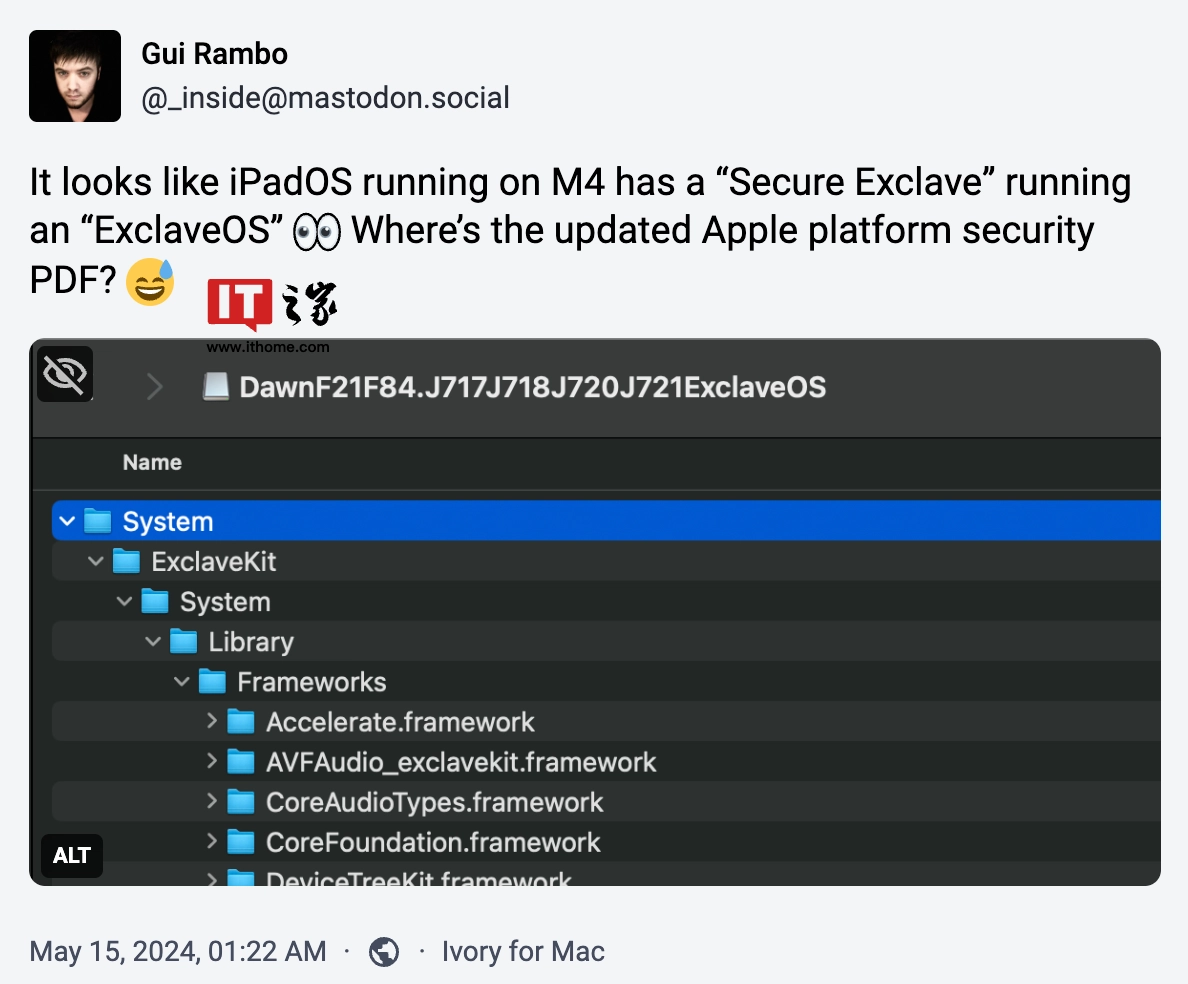 IT之家此前报道,苹果公司的 Secure Exclave 可以追溯到 M4 iPad Pro,最初由开发者 Guilherme Rambo 披露。