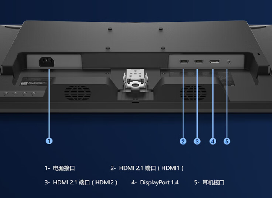 G2725D 显示器的支架比较普通,只有 -5° 到 21° 的俯仰调节;接口方面配备了 DP 1.4 和双 HDMI 2.1 接口。