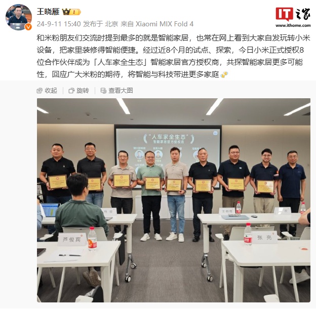 IT之家 9 月 12 日消息,小米集团副总裁、中国区总裁王晓雁 9 月 11 日透露,经过近 8 个月的试点、探索,今日(9 月 11 日)小米正式授权 8 位合作伙伴成为「人车家全生态」智能家居官方授权商,共探智能家居更多可能性。