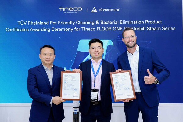 TÜV莱茵为Tineco智能洗地机FLOOR ONE S7 Stretch Steam Series颁发了"宠物友好清洁"和"除菌产品"双认证,展现了其在网络安全与清洁性能方面的双重优势。。