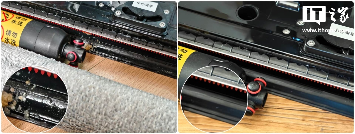 从图中拆开的滚刷就能看到细节:内部藏着微刻锁水压条,它主要有两个作用,一是锁住水渍和毛发,二是能有效降低滚刷绒布的含水量,这样清洁后地面的水残留也会更少。