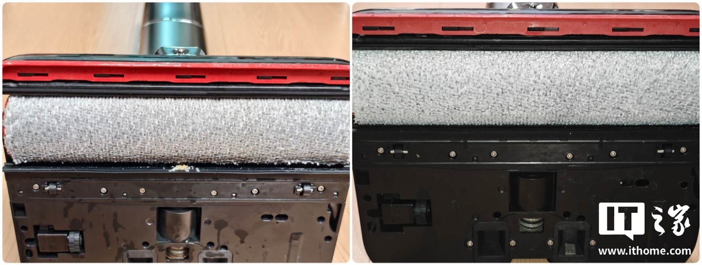 光说技术不够,我们直接看实际清洁效果:从图中能明显看到,自清洁后的滚刷变得异常干净,而且绒布依旧保持蓬松状态,没有残留的污渍结块。