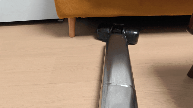 还有 80° 超广扭转角度,在餐桌椅之间穿梭,还是绕着沙发腿、茶几边角清洁,都能灵活转向,整个清洁过程很丝滑。