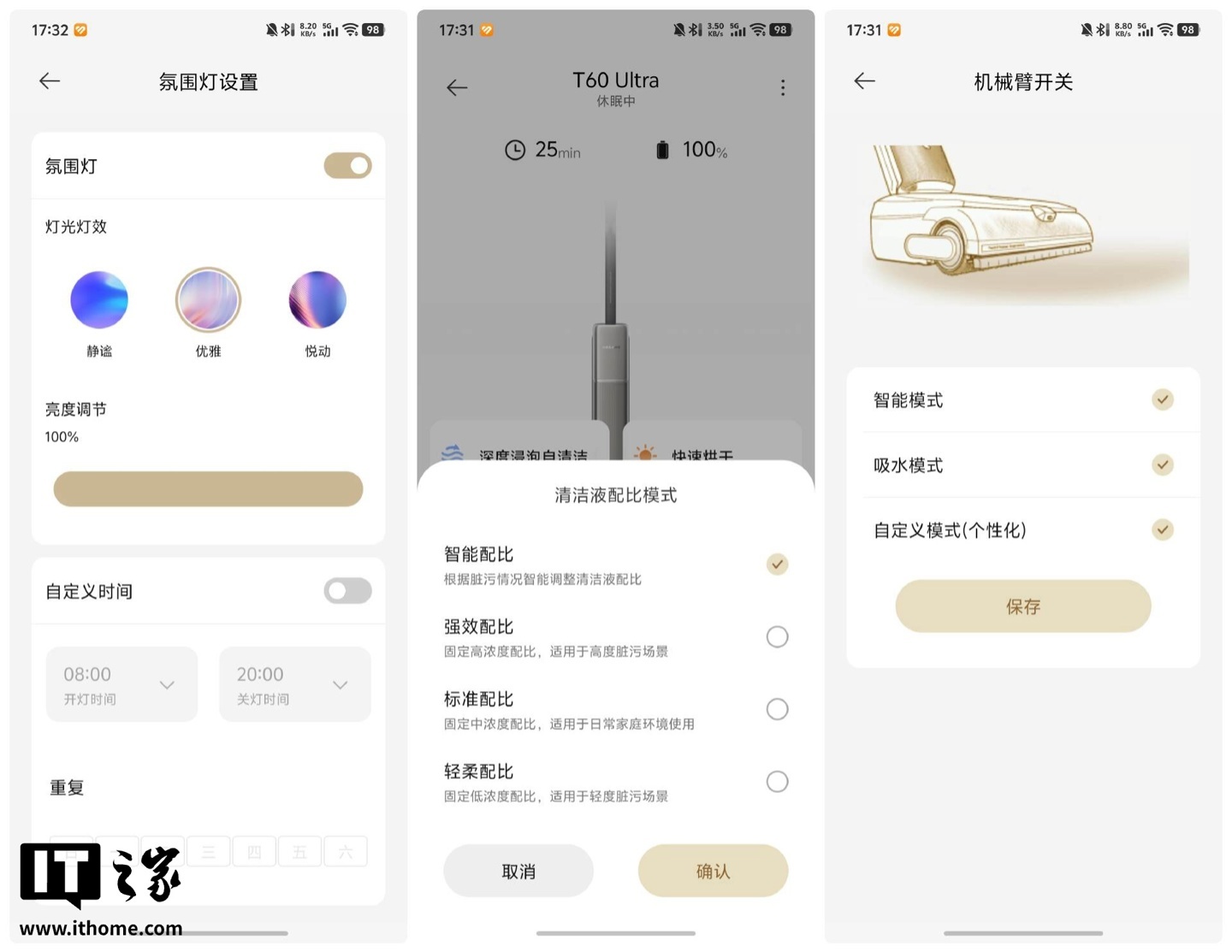 此次 T60 Ultra 在 App 交互上,还加入了不少新选项,比如上文提到过的氛围灯设置,还可以选择清洁液配比模式;又或者机械臂开关。