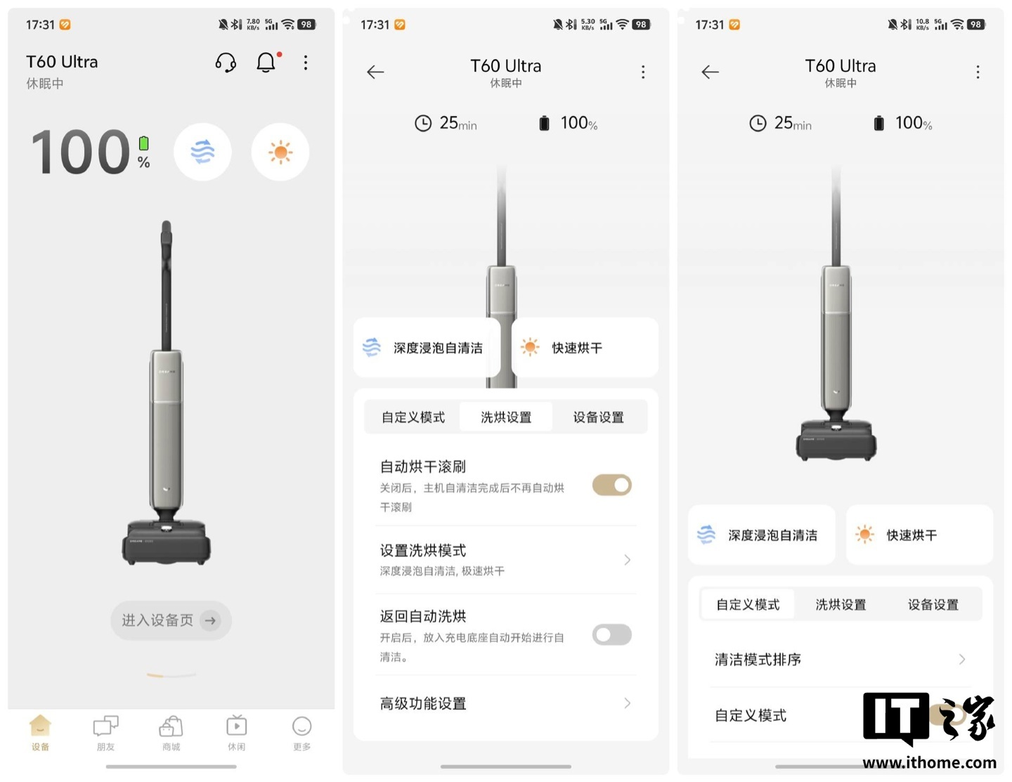 作为一款智能洗地机产品,T60 Ultra 自然也是支持 App 互联和远程控制的。这个功能的好处笔者已经在此前的追觅评测中提到过多次了:人不在家的时候,可以远程控制自清洁,避免噪音打扰家人休息。还可以设置洗烘选项,比如是深度浸泡还是轻度,比如急速烘干还是快速;包括吸力大小设置、滚刷数量控制等等。