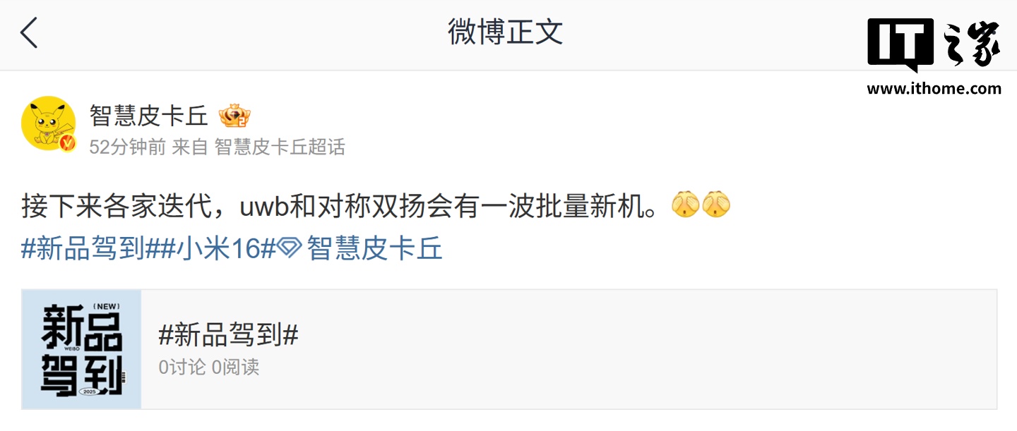 IT之家在此援引博主表述,接下来各家手机厂将会有一波批量迭代新机搭载 UWB(超宽带)和对称双扬声器,结合博主文中 Tag 暗示和评论区猜测,预计小米 16 系列手机在列。
