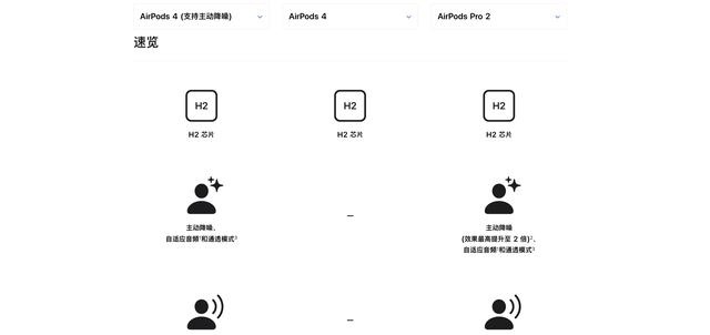 值得注意的是,AirPods 4主动降噪款对比在售的AirPods Pro 2,还被取消了降低高音量、对话增强和背景音三个功能的支持。