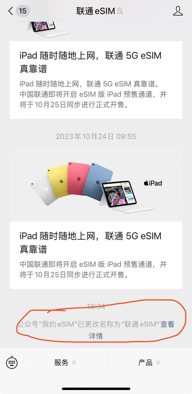 9月9日,中国联通旗下的微信公众号“我的eSIM”更名为“联通eSIM”,并重新认证为“中国联通eSIM业务官方认证账号”。该公众号的认证主体为联通华盛通信有限公司。其注册及更名历程如下:2022年4月18日,注册名称为“eSIM注册临时使用”;2022年7月27日,更名为“我的eSIM”;直至2025年9月9日,再次更名为“联通eSIM”并完成官方认证。