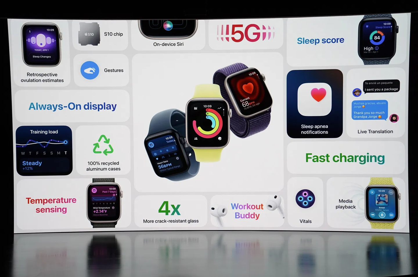 SE 3 新增睡眠呼吸暂停检测和睡眠评分功能。可通过扬声器播放音乐和播客。电池续航时间长达 18 小时,充电速度提升 2 倍。