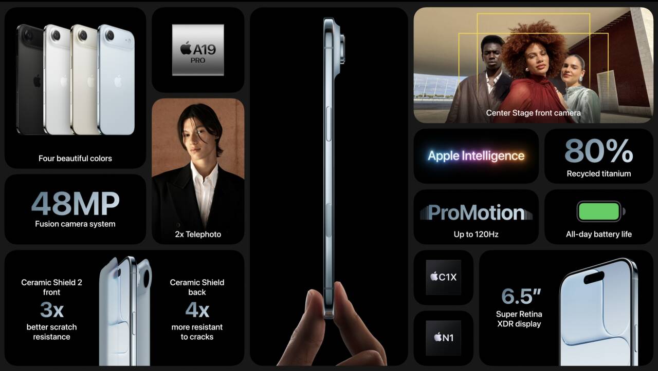 该机搭载 A19 Pro 处理器,引入第二代动态缓存结构,GPU 峰值运算能力高达 A18 Pro 的 3 倍。同时还引入了苹果设计的 N1 芯片,支持 Wi-Fi 7、蓝牙 6.0 和 Thread 网络。还引入了 C1X 苹果自研调制解调器。