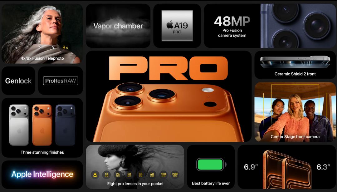 在机身里面,同样是第三代 3nm 制程工艺的 A19 Pro 处理器,而且是所谓的「满血版」。从 8GB 升级到 12GB 内存,多出来的部分除了提供更强(但你不知道啥时候才能用上)的 AI 性能之外,或许也是支持 Pro 系列本次独占的专业相机视频功能的关键。
