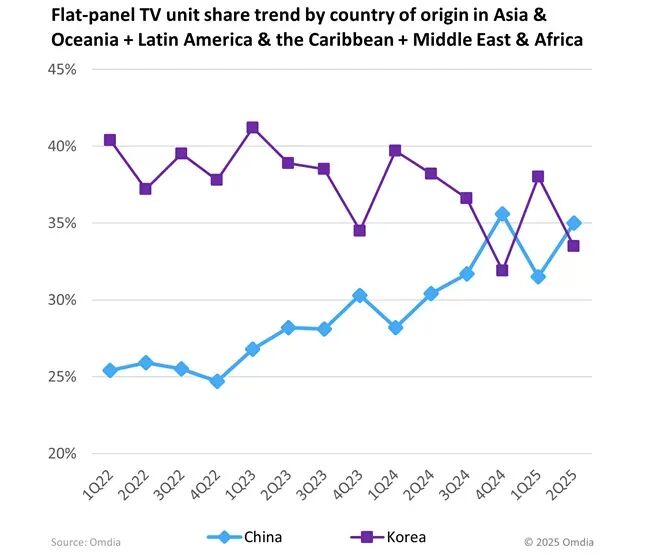Omdia电视机研究首席分析师Matthew Rubin表示:“欧洲和北美第二季度表现不佳,直接原因是库存再平衡。自去年下半年起,为应对美国更高关税,主要品牌提前在这两个市场增加了出货量,这一战略调整直接影响到第二季度的出货情况。”