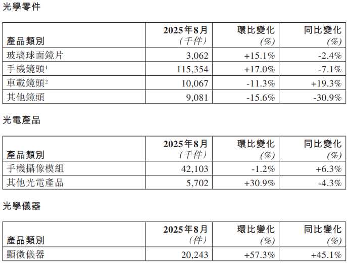 舜宇光学于9月8日发布自愿公告,披露了2025年8月各主要产品的出货量数据。数据显示,舜宇光学在光学零件、光电产品和光学仪器三大业务板块均有不同程度的表现。