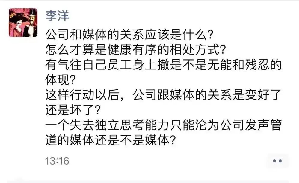 王腾事件之后,有好事者翻出了2019年36氪首席内容官李洋的五问朋友圈。当时,一位徐姓员工因为涉嫌泄露快手春晚方案、K3策略和电商数据和策略给36氪等媒体,而被快手解除劳动合同,所有期权也被追回。李洋在朋友圈回应时发问“公司和媒体的关系应该是什么?怎么才算是健康有序的相处方式?有气往自己员工身上撒是不是无能和残忍的体现?这样行动以后,公司和媒体的关系是变好了还是坏了?一个失去独立思考能力,只能沦为公司发声管道的媒体还是不是媒体?”虽然是6年前的追问,但如今在王腾事件的背景中再读来,依然值得深思。