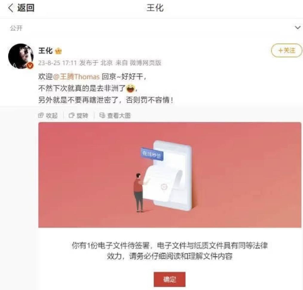 2023年8月,小米公关部总经理王化发微博喊话王腾“回京~好好干,不然下次就真的是去非洲了,另外就是不要再瞎泄密了,否则罚不容情!”